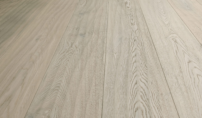 This European white oak hardwood floor sends off a cool, relaxing vibe with its sandy texture that reminds us of the Lazio beaches in Italy. Its smooth lines are wire-brushed to accent the deep textured grain and create subtle texture variations. Featuring kissed edges, this engineered hardwood floor is offered in 9.5-inch wide planks and sturdy enough to handle heavy foot traffic with a durable lacquer finish.